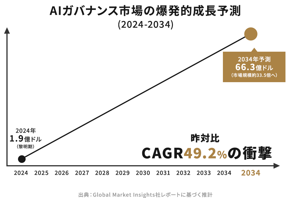 AIガバナンスの市場規模は、年平均成長率(CAGR)約49%で成長し、2034年には現在の30倍以上の規模になると予測されています。